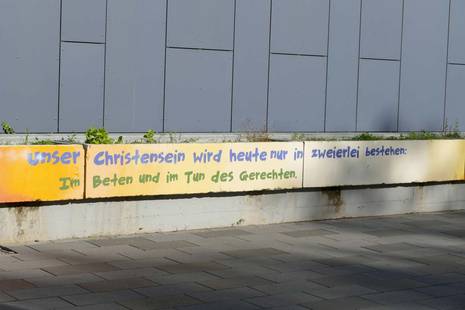 Im Frühjahr 2019 sind anlässlich des 74. Todestages von Dietrich Bonhoeffer um den Gottesdienstraum herum Graffitis entstanden. Sie sollen den Namensgeber unserer Gemeinde im Stadtteil etwas sichtbar machen und Trost und Hoffnung vermitteln.
